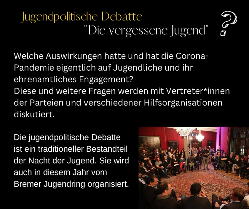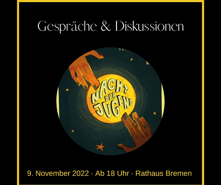 Am Mittwoch, 9. November 2022, fand im Bremer Rathaus wieder die Nacht der Jugend statt. Es war inzwischen die 25. Ausgabe. Sie steht für eine kreative Auseinandersetzung mit dem Gedenken an die Opfer der Reichspogromnacht am 9. November 1938. Dieses Jahr fand sie unter dem Motto "Stay Together" statt. Mit dem Motto "Stay Together" betont die Nacht der Jugend insbesondere vor dem Hintergrund internationaler Konflikte und Krisen die Wichtigkeit von Solidarität und gesellschaftlichem Zusammenhalt.
